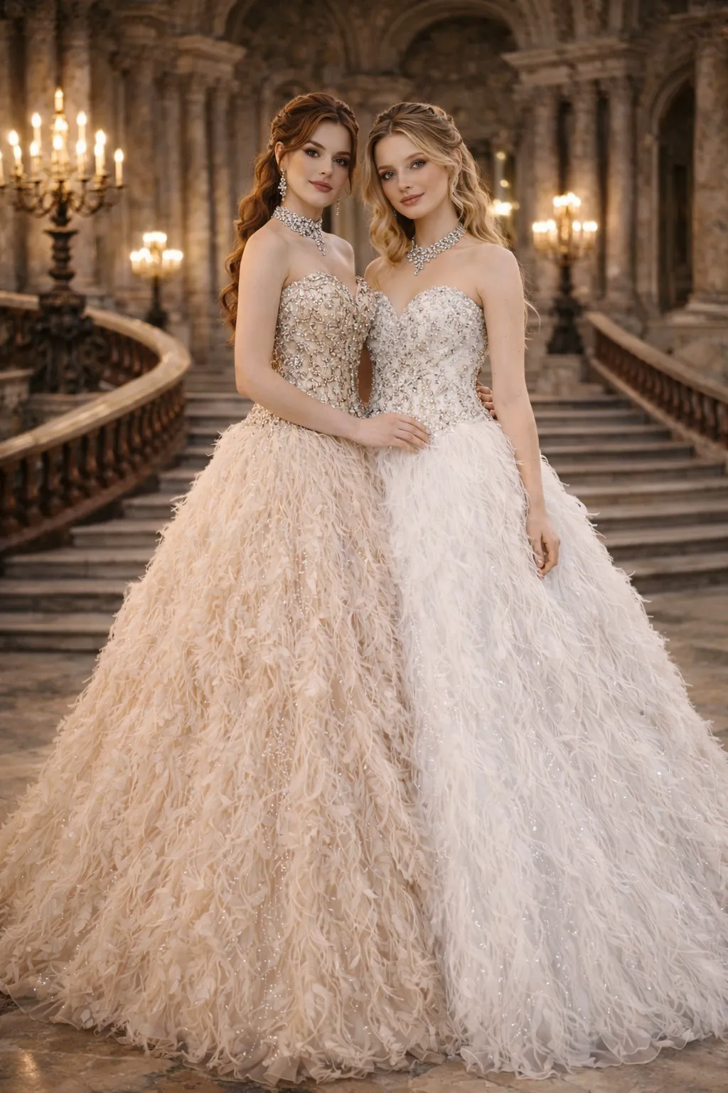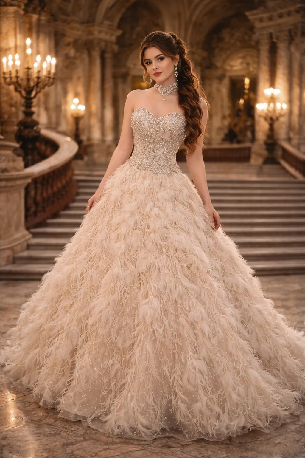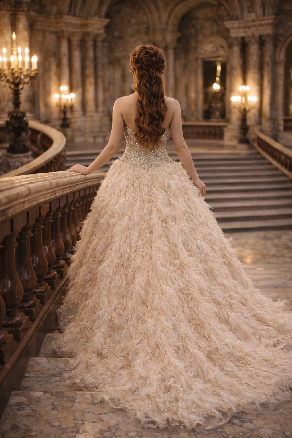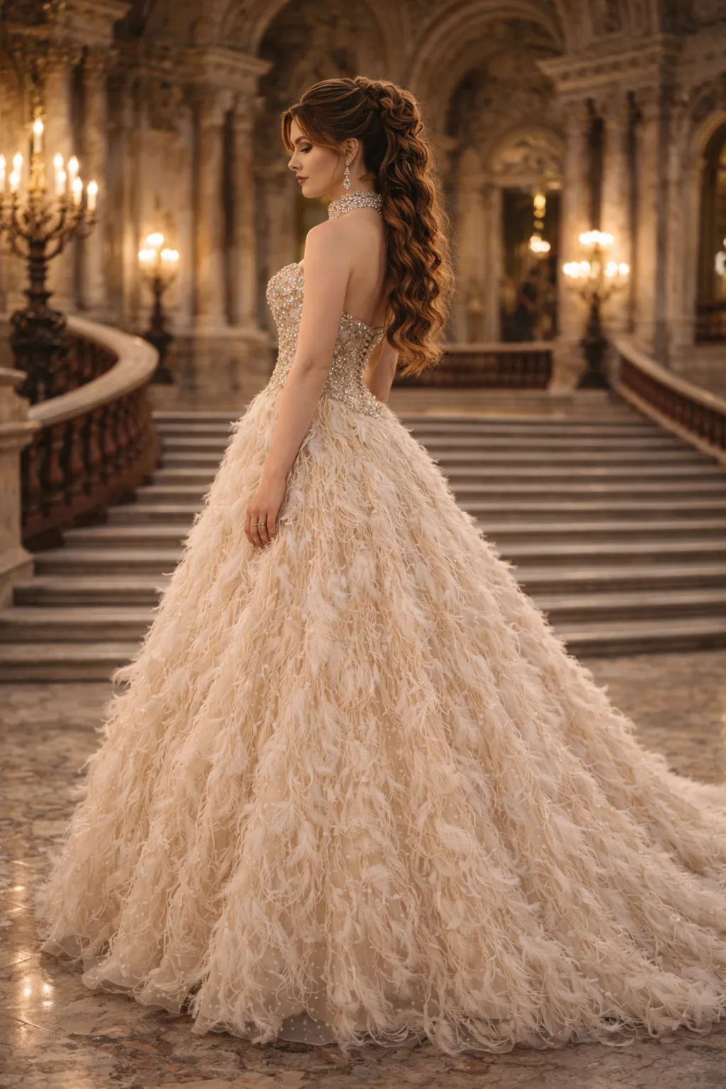 Découvrez cette robe de soirée éblouissante, ornée d'un bustier brillant en délicate broderie qui souligne élégamment la silhouette. Sa jupe volumineuse en plumes dorées crée un effet spectaculaire, parfaite pour des occasions formelles telles que les galas, les mariages ou les soirées de prestige.