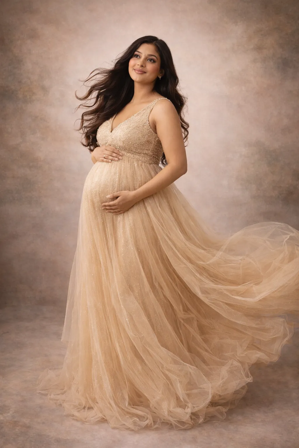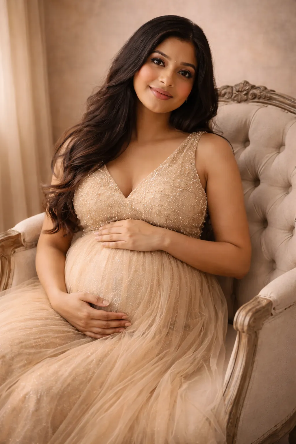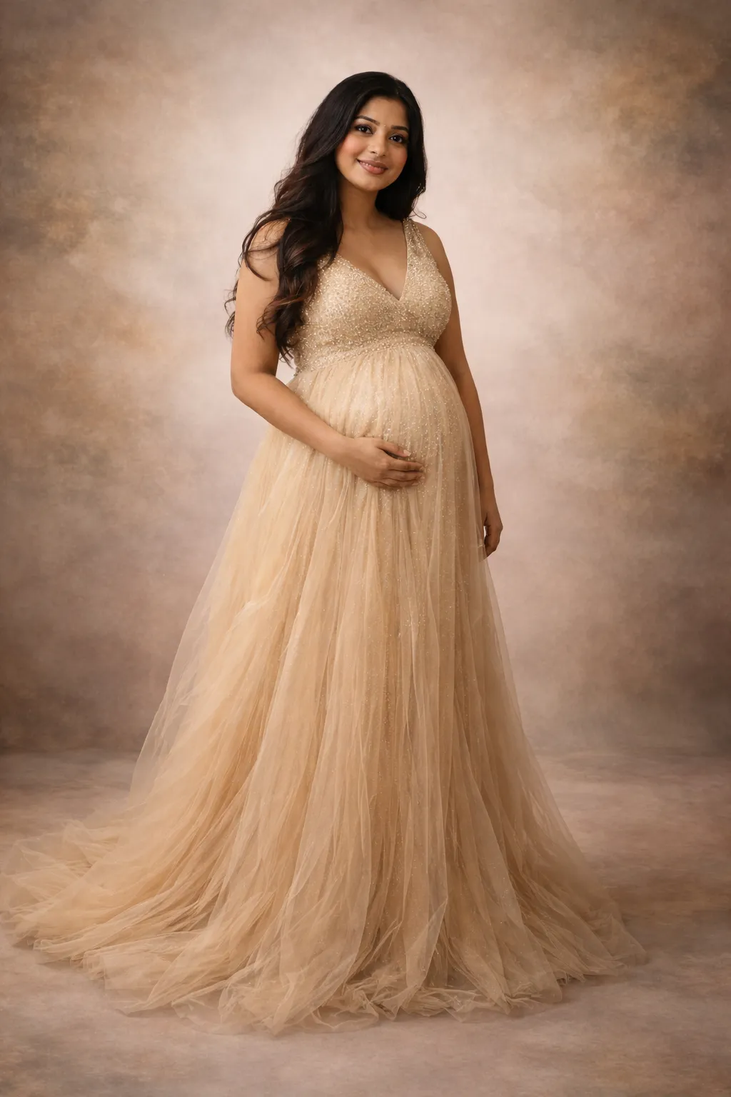 Découvrez cette robe longue en tulle délicat, sublimée par des accents scintillants sur le décolleté en V. Sa silhouette fluide et sa taille empire mettent en valeur la féminité tout en offrant un confort inégalé, parfaite pour des occasions spéciales comme une baby shower ou une séance photo mémorable. Un choix élégant qui allie glamour et douceur pour les futures mamans.