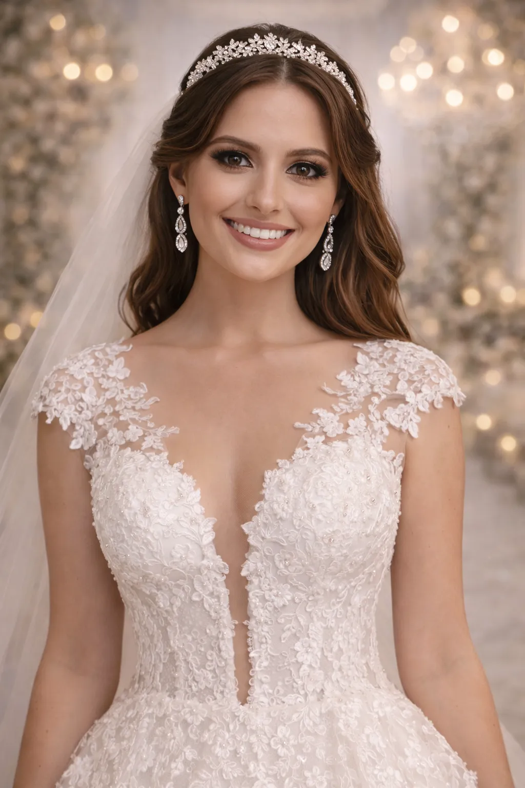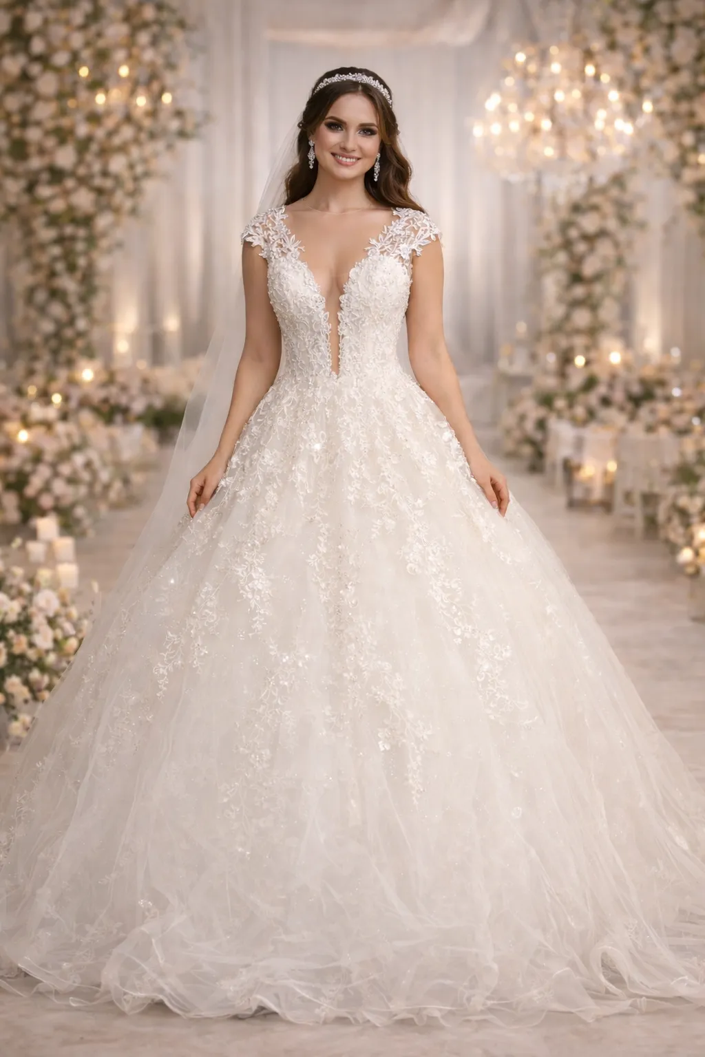 Cette robe de mariée incarne l'élégance intemporelle avec sa coupe ajustée et son décolleté en V audacieux. La délicate dentelle ornée de broderies raffinées ajoute une touche de romantisme, tandis que sa silhouette évasée flattera toutes les morphologies. Idéale pour un mariage ou une cérémonie, elle saura faire briller chaque moment spécial.