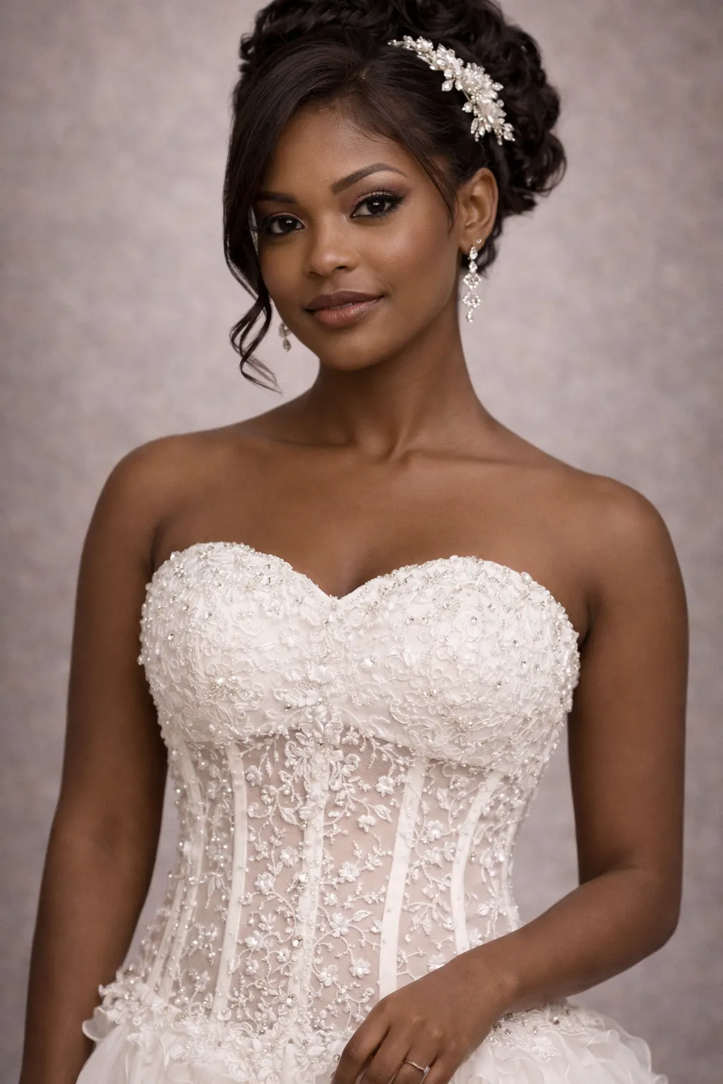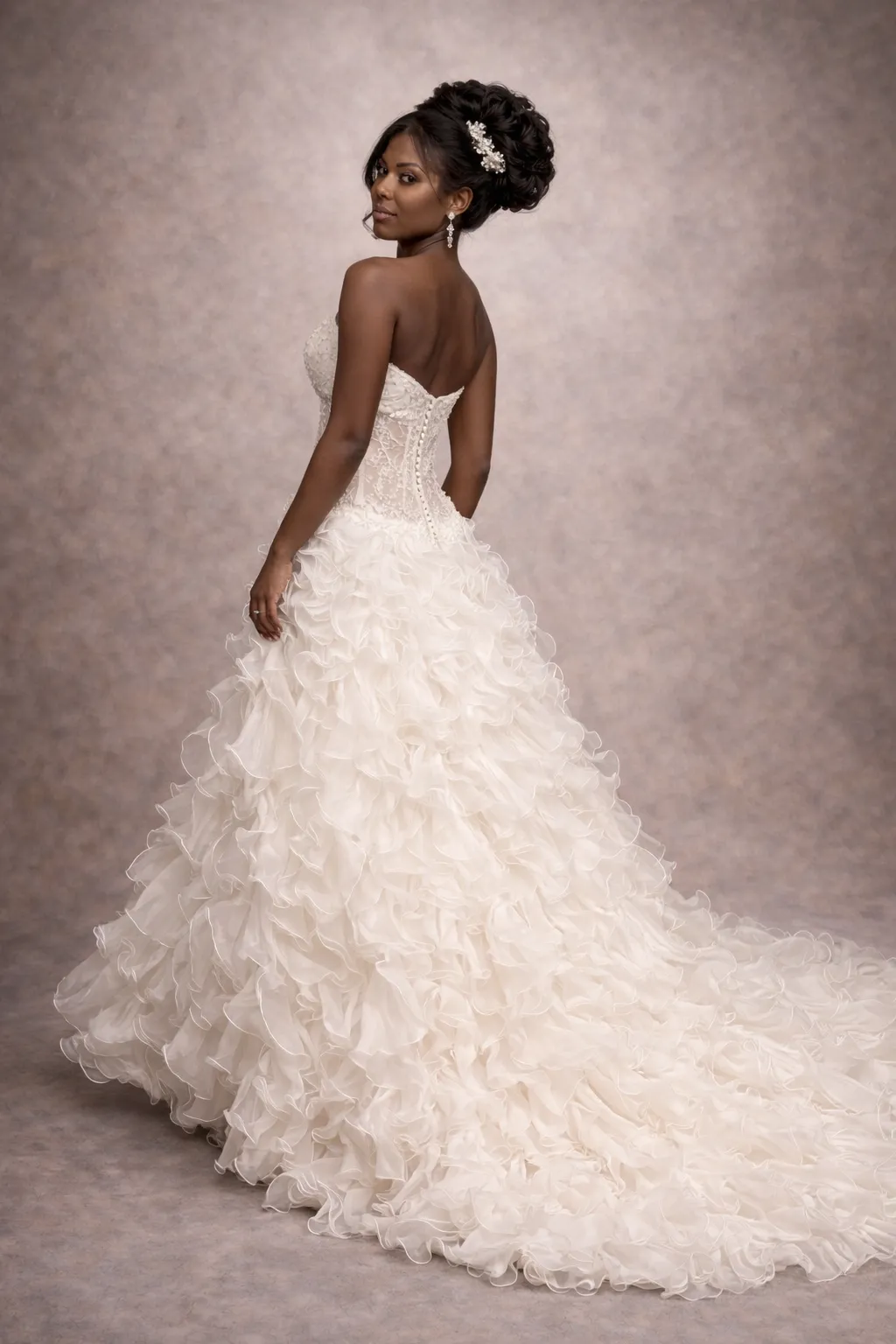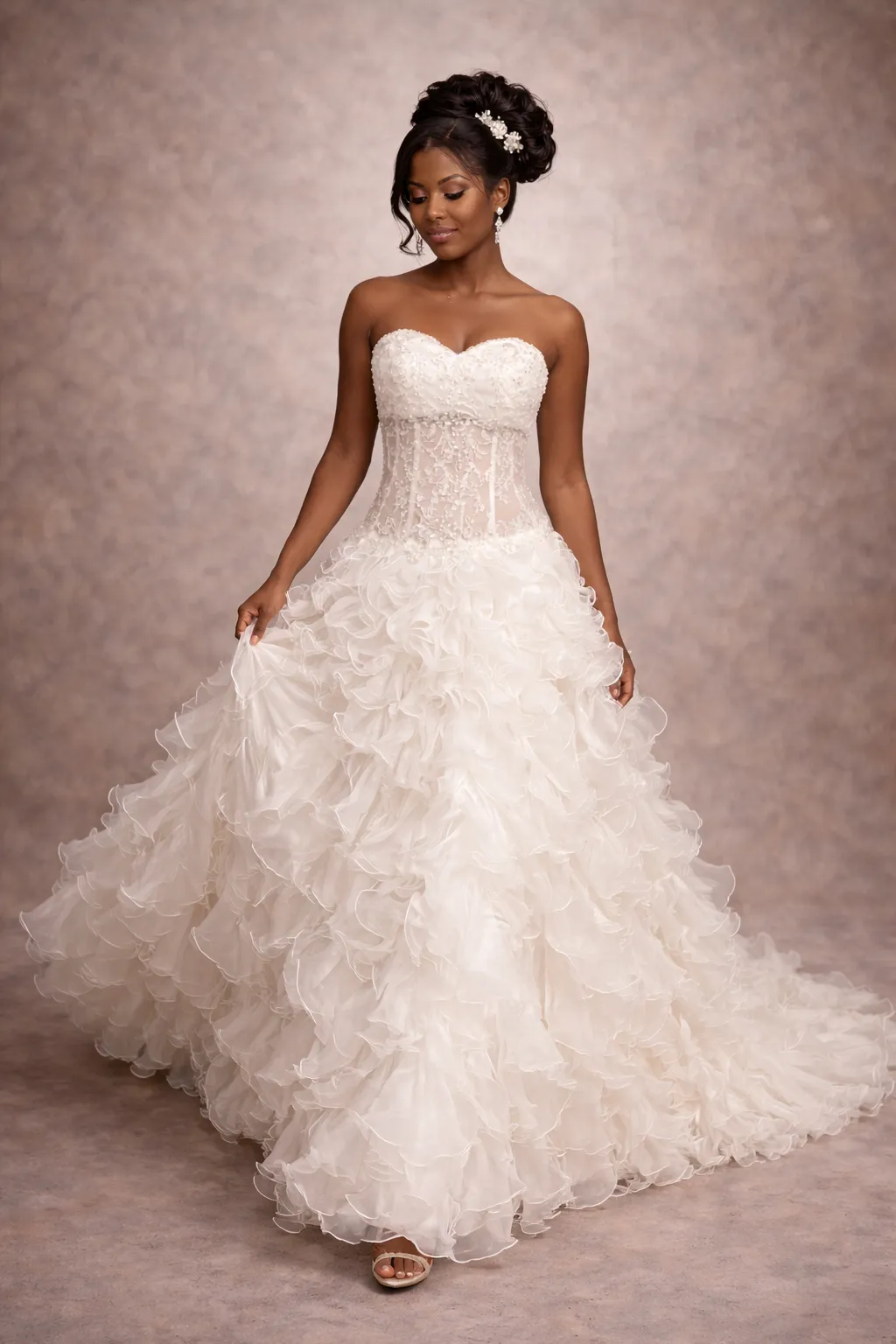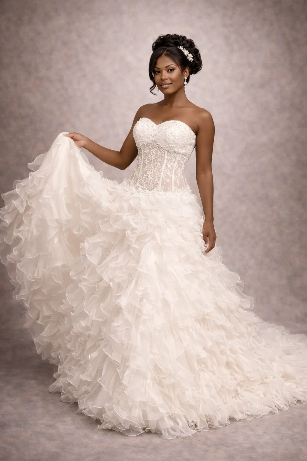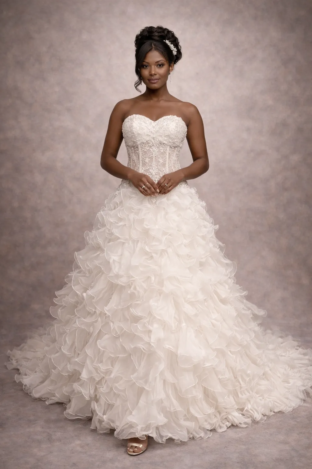 Cette robe de mariée somptueuse allie élégance et romance, avec un corsage strapless parfaitement ajusté et une jupe volumineuse en cascade de volants. La délicate dentelle et les broderies subtilement intégrées ajoutent une touche de luxe, tandis que la silhouette en A flatte toutes les morphologies. Idéale pour des mariages féeriques ou des cérémonies intimes, cette pièce exceptionnelle saura séduire tous les regards.